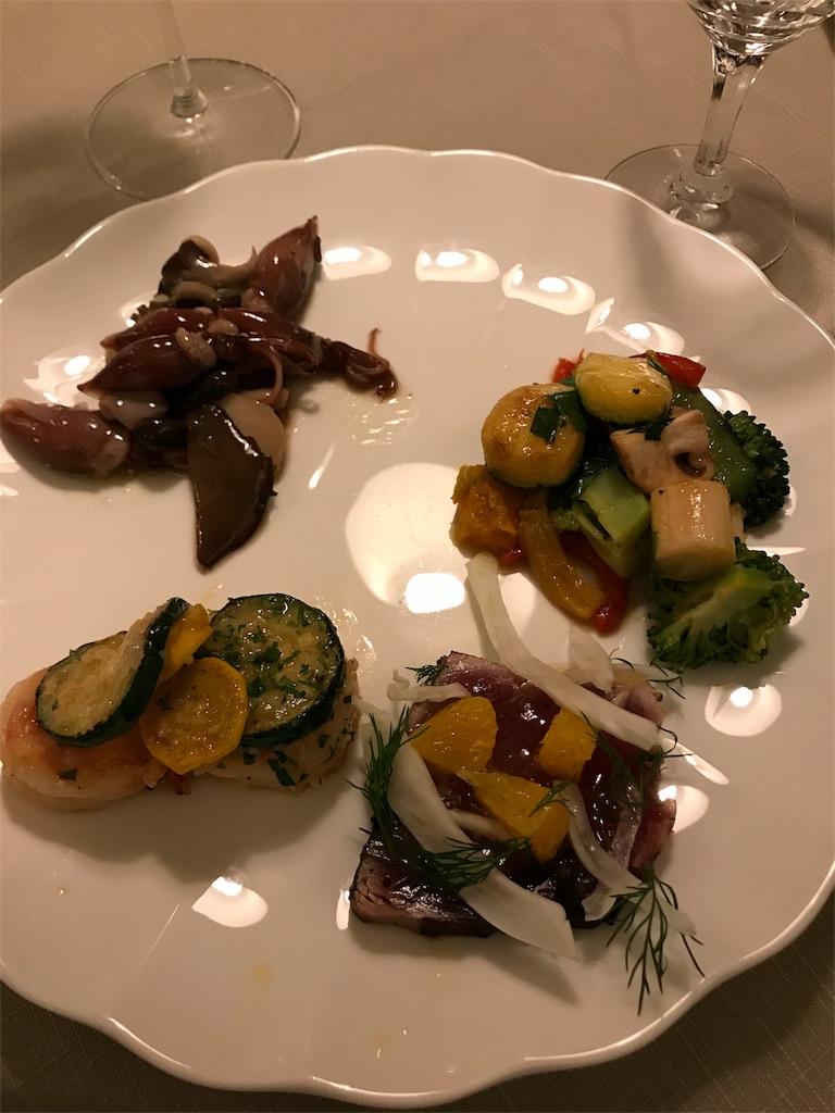 ・冷たい前菜4種類。ホタルイカ、お野菜のマリネ、エビとズッキーニ、カツオのオレンジソース。